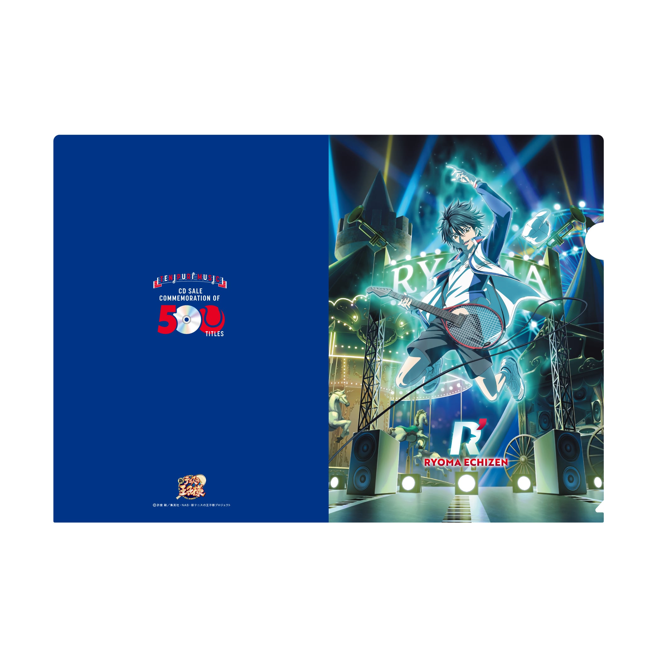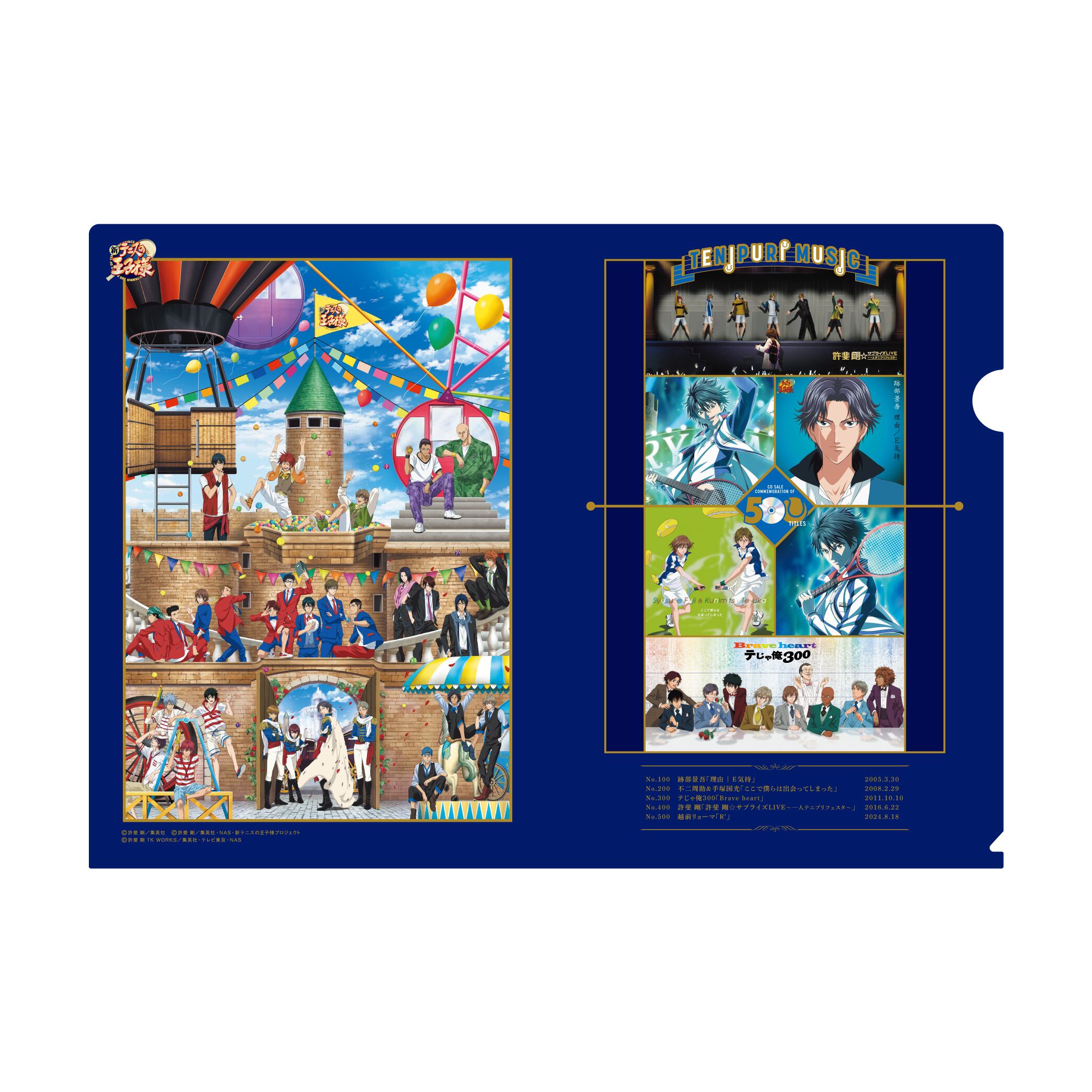 越前リョーマ『R'』と、節目のタイトル跡部景吾「理由|E気持」、不二周助&手塚国光「ここで僕らは出会ってしまった」、テじゃ俺300「Brave heart」、許斐 剛「許斐 剛☆サプライズLIVE~一人テニプリフェスタ~」、「Party Time」絵柄を使用したクリアファイル3枚セットです。